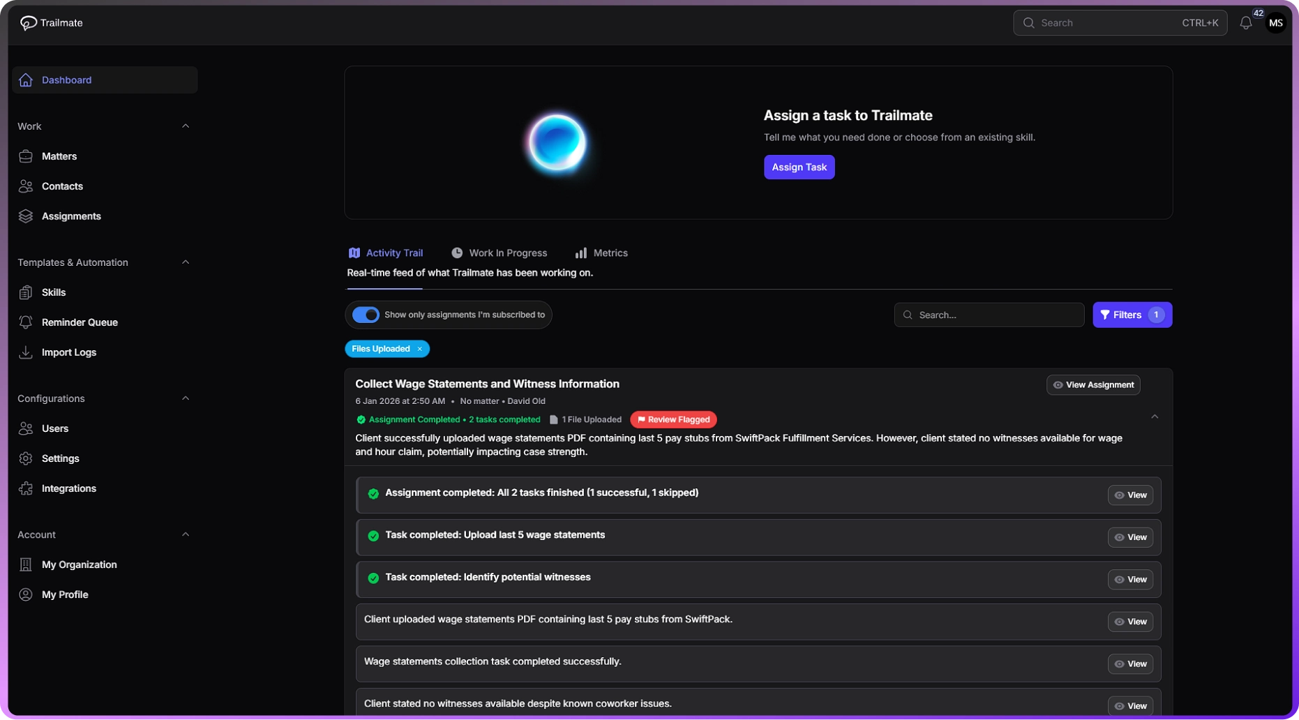 Trailmate automates intake, follow-ups, document collection, and case updates—so your team can focus on legal strategy, not chasing clients.